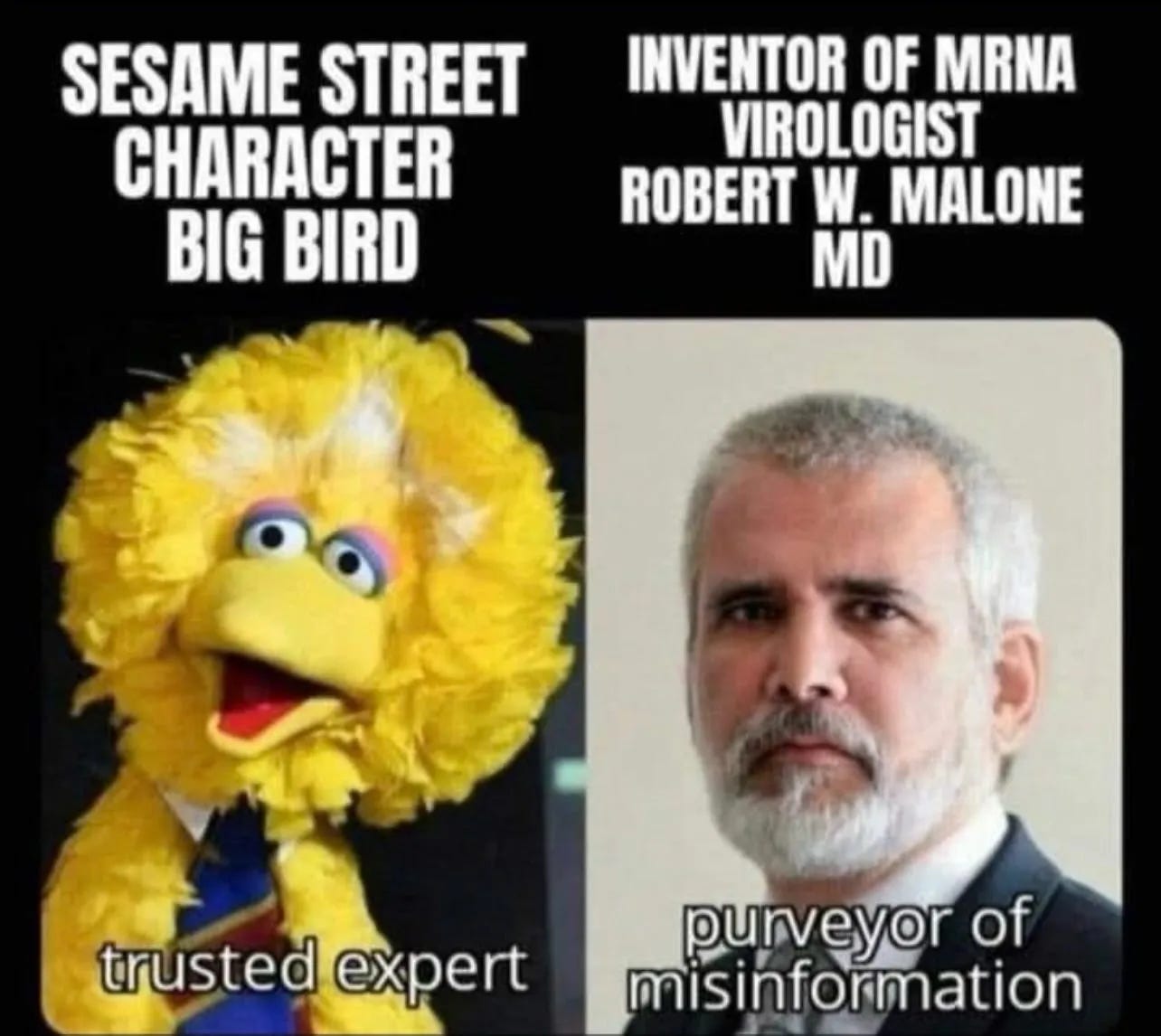 Dr. Robert Malone: This guy is the inventor of mRNA vaccine technology. Not much more to say on that really. Here I wrote about Malone in May 2022. He has defiantly [sic] had an awakening over the last two years. [Quotes Malone on working for a sham profit-oriented industry that he thought was committed to saving lives. Includes the following meme.