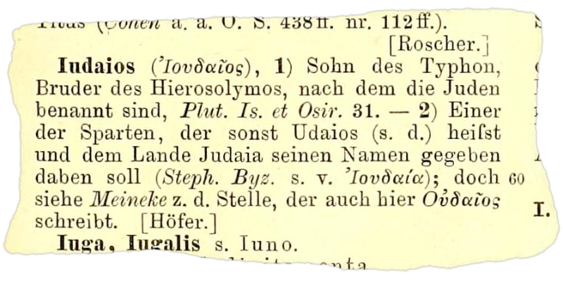 Iudaios (Ioudaios), 1) Son of Typhon, brother of Hierosolymos, after which the Jews are named, Plut. Is. et Osir. 31. -- 2) One of the Spartoi, otherwise called Udaios (q. v.) and said to have given Judea its name (Steph. Byz. q. v. Ioudaia); q.v. Meineke spelling him Oudaios. [Höfer]